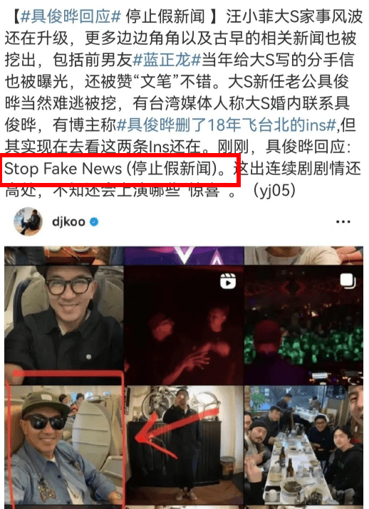 不但公开了2018年12月8日的照片力证清白,直言照片中被他视为重要的人不是大S,而是一名圈外人,还在发文中喊话“停止假新闻”。