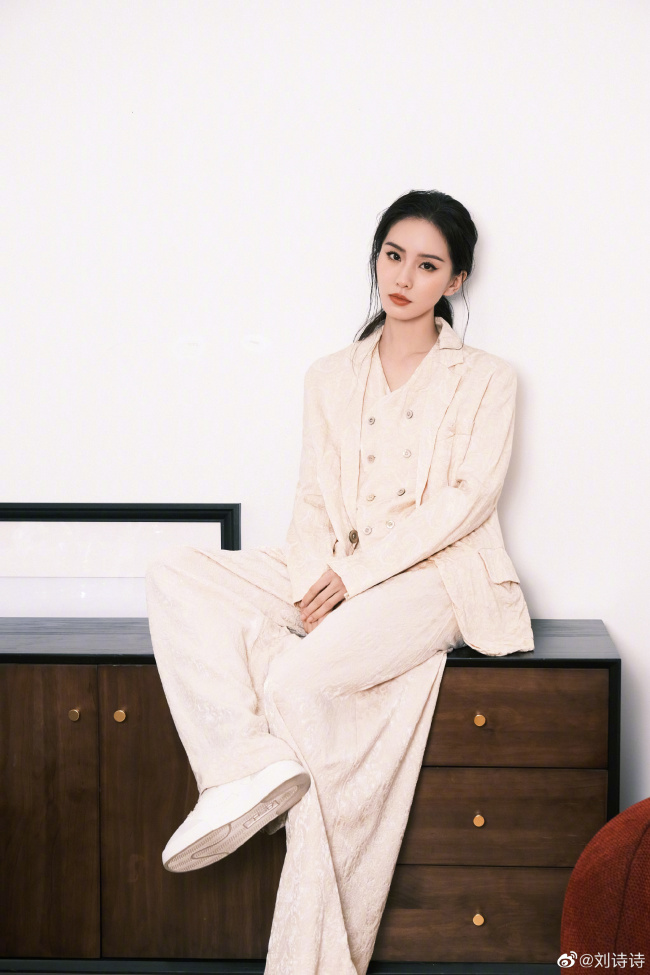 刘诗诗穿浅色套装发丝凌乱 气质清冷又慵懒