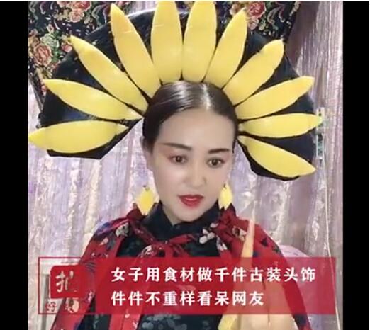 原标题:女子用食材做千件古装头饰 用完还能吃不浪费!