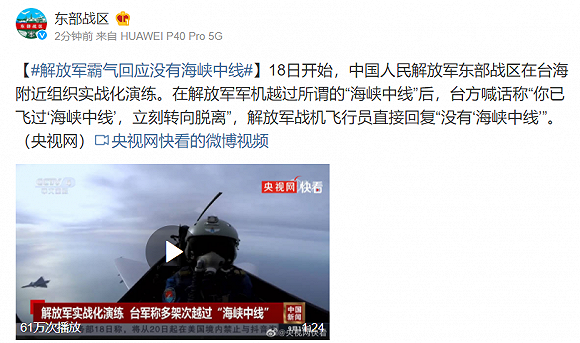 9月18日当天,解放军出动18架战机从四个不同方向,不同高度进入中国台湾地区所谓“防空识别区”。
