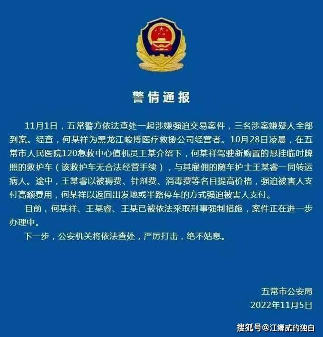 在11月5日,发生在五常市的另外一起黑救护车强制交易的案例,三名嫌疑人被依法采取刑事强制措施,他们对病患家属收取55公里3140元的收费,两相对比之下,陕西西安的这起黑救护车事件更加离谱。