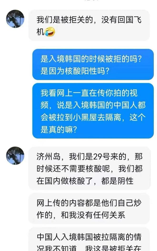 还有网友发贴称,中国人入境韩国,需要自费检测一次核酸,费用8万韩元,相当于人民币434元。中国人被安排进入的隔离设施,没有床、没有桌子、没有凳子,只能坐在地板上、睡在地板上。一天的住宿费用是15万韩元,餐费1.5万韩元,合计一天需要支付人民币900元。隔离7天,就大约需要6300人民币。