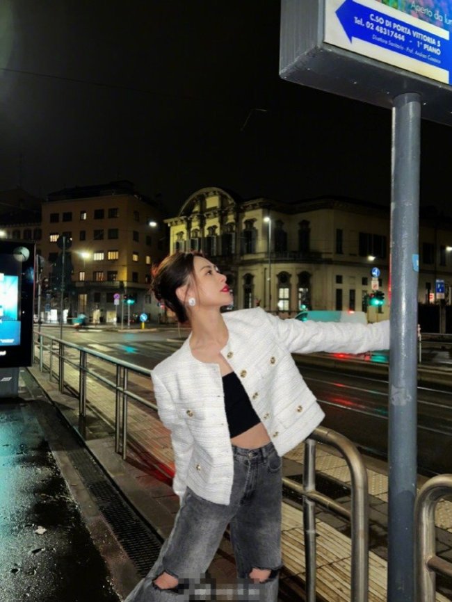 阿娇晒夜游米兰美照 米色小香风配红唇侧颜精致