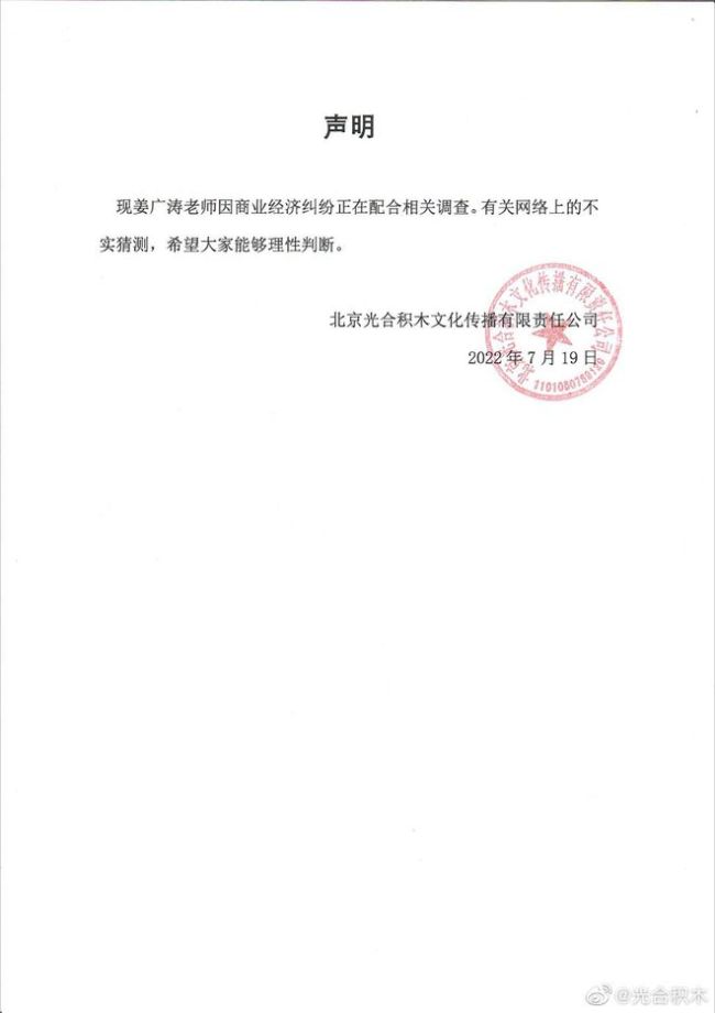 19日,其所属公司光合积木发表声明回应称:“现姜广涛老师因商业经济纠纷正在配合相关调查,有关网络上的不实猜测,希望大家能够理性判断。”