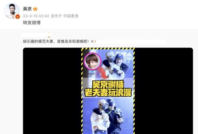 3月15日凌晨2点多,吴京转发狗仔队拍到的和谢楠轧马路的视频,带头嗑自己的cp!