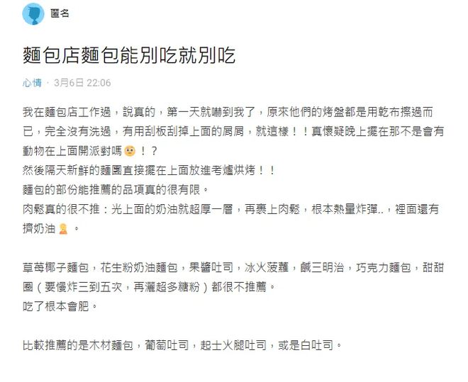 「我在面包店工作过,说真的,第一天就吓到我了,原来他们的烤盘都是用干布擦过而已,完全没有洗过!」网友在网站发文,表示工作后发现,店家会用刮板刮掉上面的屑屑,但都没洗,「真怀疑晚上摆在那不是会有动物在上面开派对吗!?然后隔天新鲜的面团直接摆在上面放进烤炉烘烤!!」