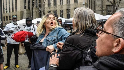 报道说,根据现场视频和图片显示,法庭外聚集有反对特朗普的人士,他们举着横幅,上面写着“特朗普一直在撒谎”,他们还呼吁逮捕特朗普。而一名戴着特朗普经典口号“让美国再次伟大”帽子的女士与这些人发生了口角和推搡。值得注意的是,这一切都在媒体的摄像头记录下完成。