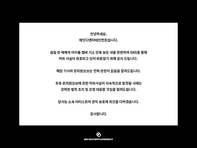 韩国演艺圈爆出同性性侵事件,现为6人男团成员B练习生时期遭队友A强制猥亵至少3次,受害的B报案提告,A后来退团并坦承部分犯罪行为,遭检方求处3年有期徒刑。昨消息曝光后震惊各界,网友根据线索纷纷猜测男团身分,「OnlyOneOf」刚好如人数符合也有人退团被点名,经纪公司「8D娱乐」赶紧发声撇清。