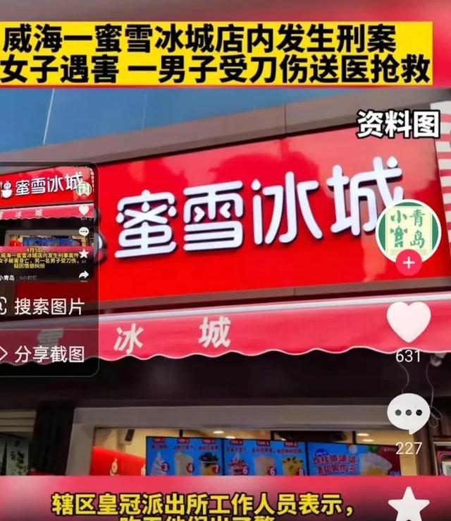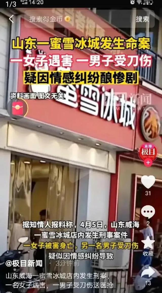 4月5日,山东威海一家蜜雪冰城店里突发一起一死一伤情杀刑事命案。