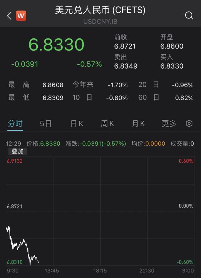 4月14日,人民币对美元即期汇率开盘后接连升破6.86、6.85、6.84关口,盘中一度逼近6.83关口,最高至6.8309,一度较前一交易日收盘价升幅达到400点。