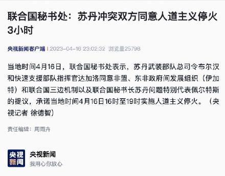 当地时间4月16日,联合国秘书处表示,苏丹武装部队总司令布尔汉和快速支援部队指挥官达加洛同意非盟、东非政府间发展组织(伊加特)和联合国三边机制以及联合国秘书长苏丹问题特别代表佩尔特斯的提议,承诺当地时间4月16日16时至19时实施人道主义停火。(央视)