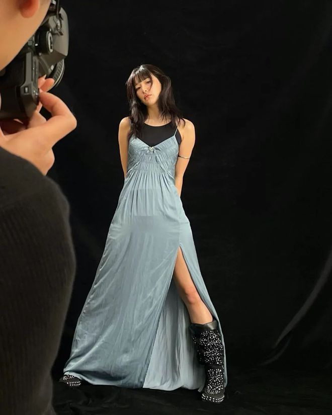 陈都灵一袭绿色抹胸长裙 站在柳树下宛若自然精灵