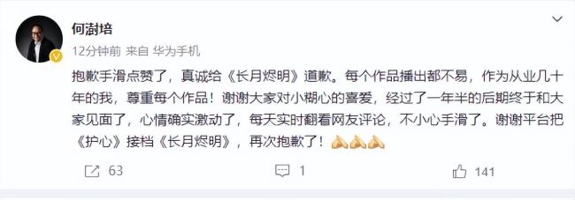随后,何澍培发文向《长月烬明》道歉,称每天实时翻看网友评论,不小心手滑了,“每个作品播出都不易,作为从业几十年的我,尊重每个作品!”“谢谢平台把《护心》接档《长月烬明》”。