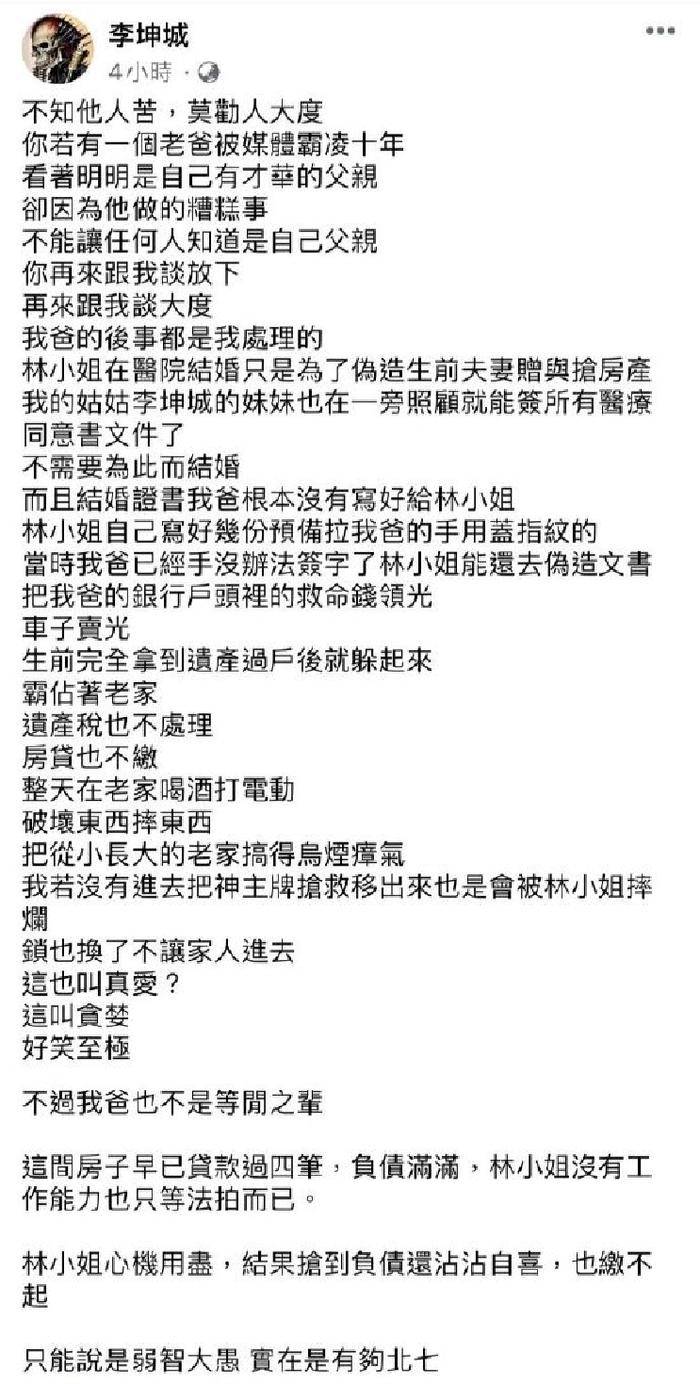 起因就是在5月27日,疑似李坤城的儿子通过李坤城社交账号上发文,曝光林靖恩为争夺财产而实施的一系列行径,称林靖恩是在父亲李坤城要气切且无法沟通后这才通知他父亲病重的情况,甚至还伪造文书,就是为了争夺房产。