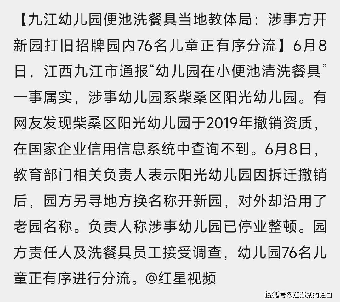 关于这所柴桑区幼儿园,网上并没有查到更多的信息,红星新闻对此事进行跟踪报道,当地的教体局回应幼儿园的相关情况,“涉事方开新园打旧招牌,园内76名儿童正有序分流”。
