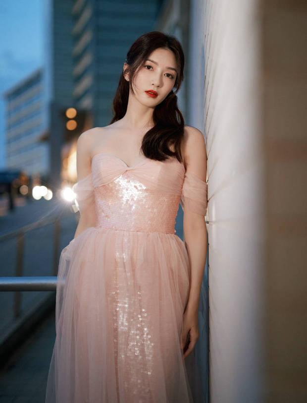 江疏影穿淡粉色纱裙,眼含柔情,温婉沁人。