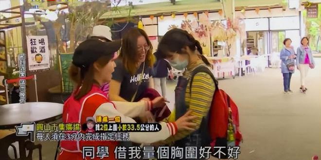 如果说以上的任务坑害的还只有参加节目的艺人,毕竟他们拿了通告费了,上节目前知道节目是什么调性,自己心甘情愿,那么接下来要求找寻胸部比女嘉宾小的女性就是无差别扫射所有无辜路人了,当场拦住路过的女性要量人家胸围,什么时候这么隐私的事情也能在大庭广众之下当话题调侃了。