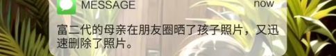 富二代母亲还在朋友圈晒过孩子,但是很快就删除了,估计也是怕有人认出来孩子母亲,带来不好的影响。