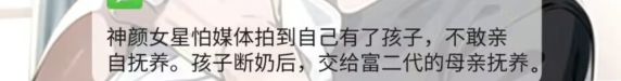 但是从始至终二人都没有领证,这孩子完全是个意外,但是不知为何,女星也没有选择打胎,最终还是留下了孩子,停了一段时间工作找地方休养生产,可是单身女星如果带着娃终究是个隐患,所以将孩子养到孩子断奶了,女星便把孩子送到富二代母亲那里,交由她抚养。