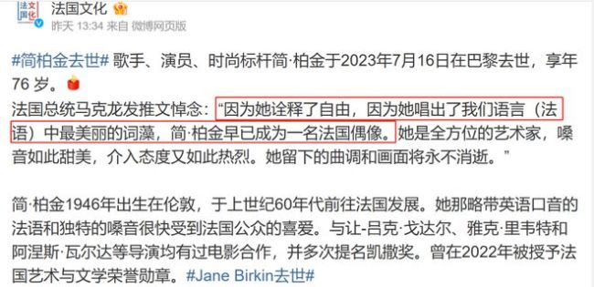 顶级女神简·柏金在巴黎家中去世,享年76岁。