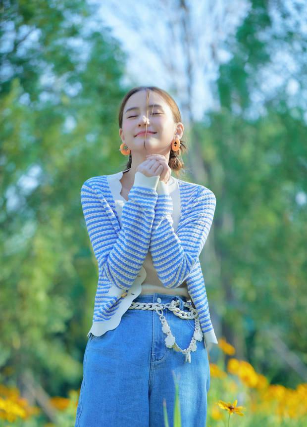 何超莲晒夏日氧气感写真 蓝色开衫丸子头青春洋溢