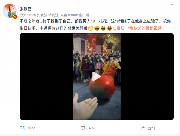 8月23日,张歆艺卡点为老公袁弘庆生,还晒出了一段袁弘AI换脸大唐不夜城不倒翁小姐姐的视频,配文:“不惑之年老O终于找到了自己,都说男人40一枝花,这句话终于在他身上应验了,祝你生日快乐,永远拥有这样的盛世美颜哦。”