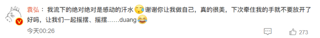 袁弘回复道:“我流下的绝对绝对是感动的汗水,谢谢你让我做自己,真的很美,下次牵住我的手就不要放开了好吗,让我们一起摇摆、摇摆……duang。”
