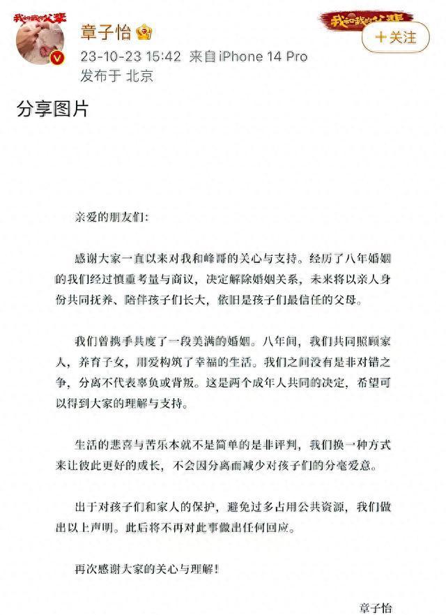 在声明中,章子怡表示,感谢大家一直以来对他们的关心与支持。在经过慎重的考量和商议后,他们决定解除婚姻关系,未来将以亲人的身份共同抚养和陪伴孩子们长大,依然是孩子们最信任的父母。值得一提的是,章子怡称汪峰为“峰哥”,这显示出两人虽然婚姻结束,但仍然保持着亲人的关系。