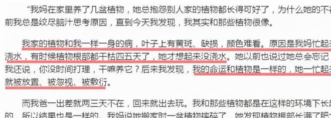 有个小学生写过一篇作文《我的生命就像家里养的植物》,控诉自己就像一盆植物,被妈妈忽视着、敷衍着。