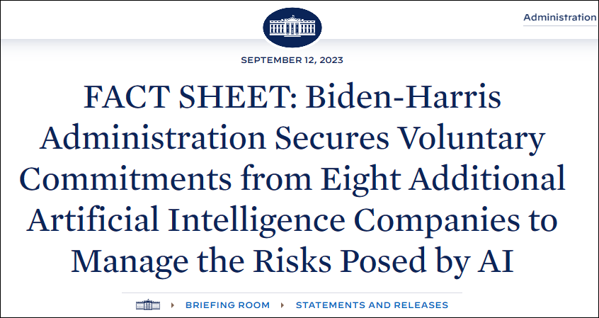 白宫网站于当地时间9月12日发布消息称,美国商务部长雷蒙多、白宫幕僚长齐恩茨和其他高级政府官员当天在白宫召集众多行业领袖,宣布拜登政府已经获得八家企业的第二轮自愿承诺。除了英伟达、IBM和Adobe之外,参与企业还包括Palantir、Stability、Salesforce、Scale和Cohere。