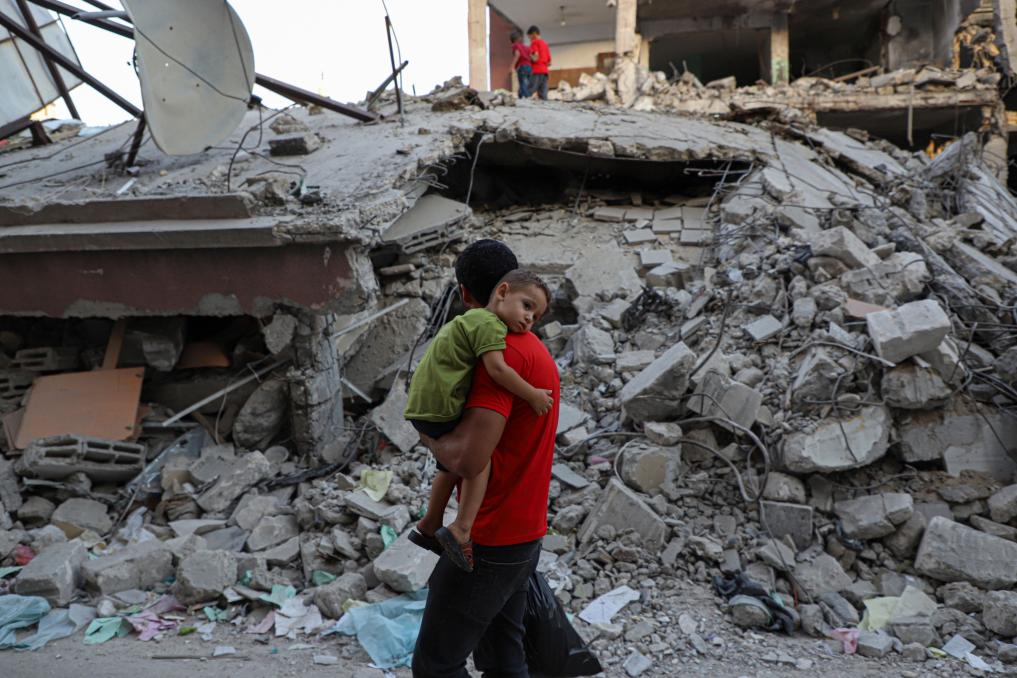 10月16日,在加沙地带南部城市汗尤尼斯,人们从遭以色列空袭损毁的建筑废墟前走过。(图/新华社)