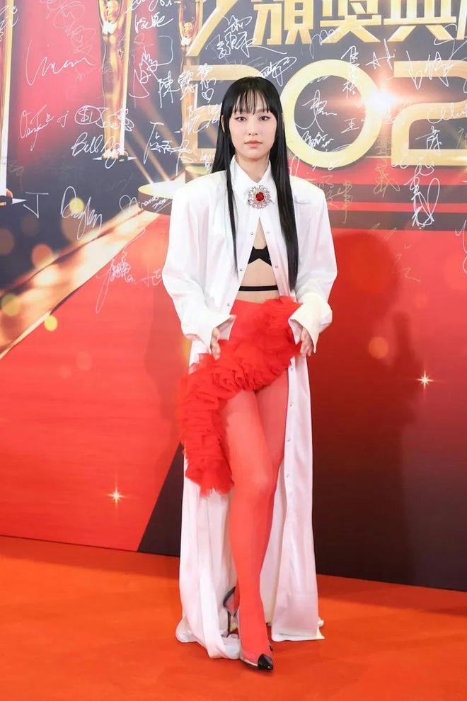 炎明熹(Gigi)继早前性感造型之后,今晚又再有大突破!身穿黑色Bra Top的她,外披白色长恤衫,下身就以红色丝袜及纱裙上阵,但一身造型就惨被狠批。