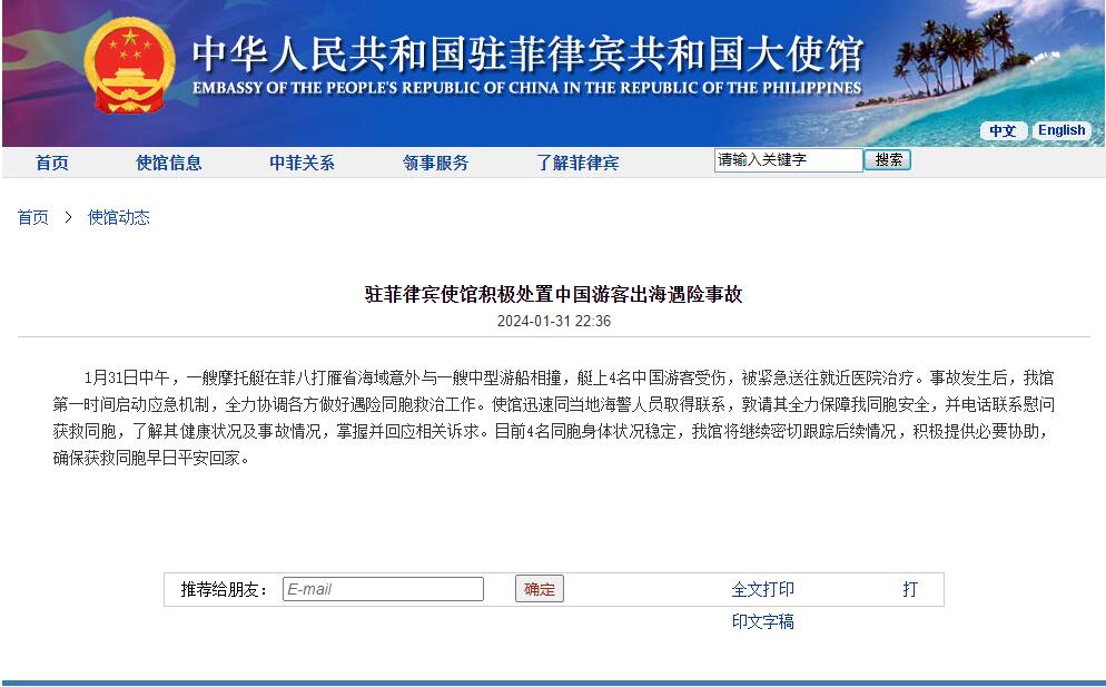 据“中国驻菲律宾使馆”网站消息,1月31日中午,一艘摩托艇在菲八打雁省海域意外与一艘中型游船相撞,艇上4名中国游客受伤,被紧急送往就近医院治疗。事故发生后,我馆第一时间启动应急机制,全力协调各方做好遇险同胞救治工作。使馆迅速同当地海警人员取得联系,敦请其全力保障我同胞安全,并电话联系慰问获救同胞,了解其健康状况及事故情况,掌握并回应相关诉求。目前4名同胞身体状况稳定,我馆将继续密切跟踪后续情况,积极提供必要协助,确保获救同胞早日平安回家。