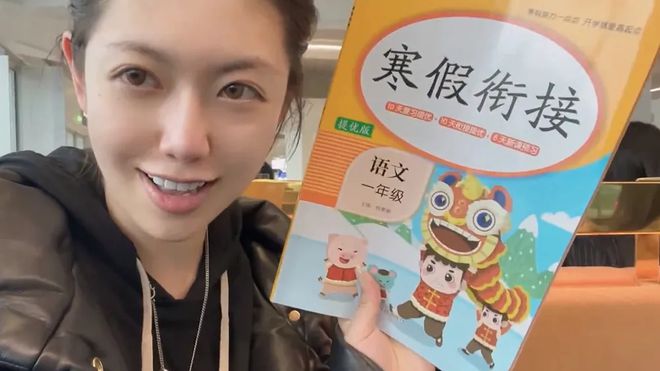 Thurman猫一杯_边拍影片边大笑,翻看作业内容发现「一点没碰」,根本一个字都没写,于是她去买了铅笔「帮忙」写作业,结果却被小学一年级的作业难倒,开始乱填答案。之后她准备搭机飞回中国时,没有忘记作业,「寒假作业我给你带回来了!一个晚上轻松写完,不用谢!」