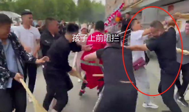 眼见新郎被打,一众伴郎也是赶快上前解围,而在这其中,一位长得很壮实的小孩子见到自己的家人被打,单纯的小孩子便直接挡在新郎前面,对着这些施暴者推搡起来,试图把新郎官尽快的解救走。