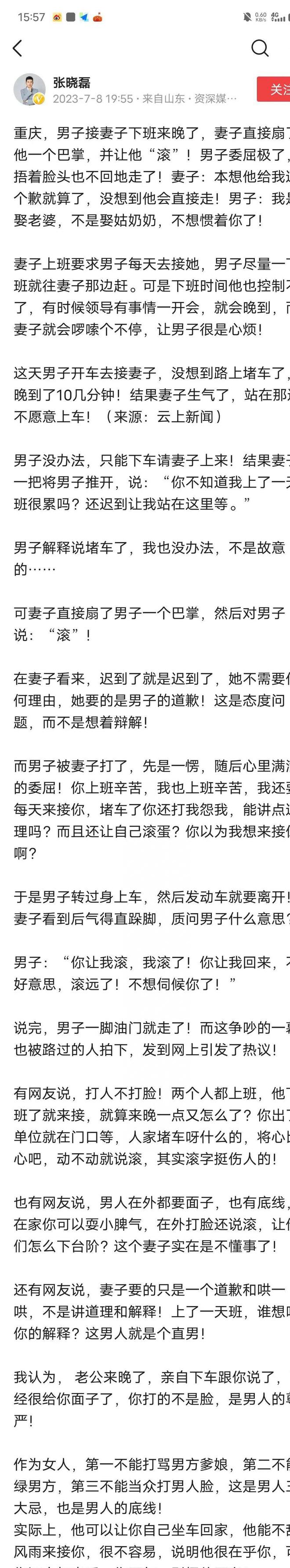 文章說的是一個年輕的小伙子,也是一个上班族;每天晚上下班回家的時間,都是自己開着自己的私家車去接老婆大人回家;這一天,因為公司的亊情多点、有时可能加班赶活有时公司開會超時延時了,這一切都有能》;可是,就是這一次;比平常時間迟到了十多分钟,竟然惹得老婆大人火冒三丈;两下冲到老公面前,啪的一個耳光就扇過去了;還一邊罵到你給我滾!老公很无奈,确实開着车走了。