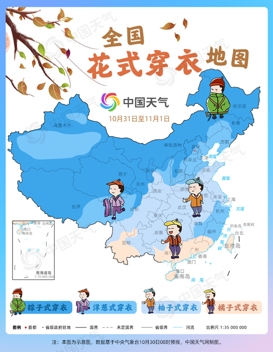 中国天气网讯 “问世间冷为何物,直教人裹紧羽绒服”!本周末(10月31日至11月1日)冷空气又双叒叕影响我国,穿厚了感觉热,穿薄点又冷,你还在纠结怎么穿衣服吗?中国天气网特别推出“全国花式穿衣地图”,看看粽子式、洋葱式、柚子式、橘子式哪种穿衣方法最适合你?让你穿衣不发愁。