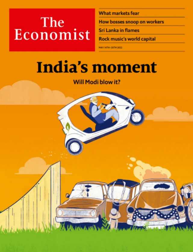 从这个角度看,印度也应该担忧《经济学人》的封面问题——《经济学人》2022年5 月宣称“印度时刻即将到来”。杂志封面上莫迪总理驾驶着一辆飞车,在古老、破败的印度上空飞跃。这一期《经济学人》的社论预言未来十年“一种新合力”——技术飞跃、能源转型、地缘政治转变构成的合理——将深刻重塑印度经济。