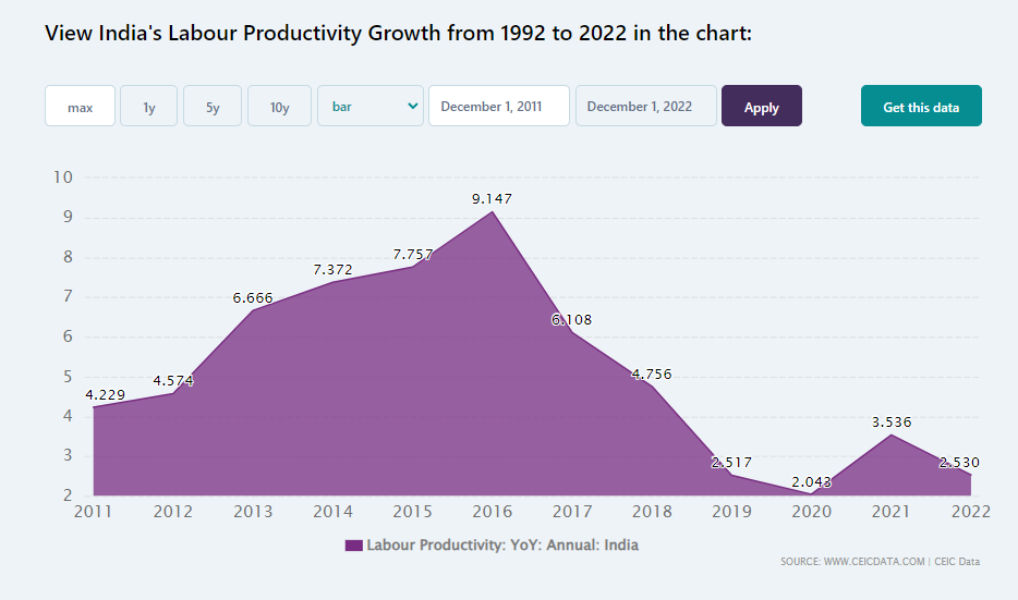 2011年至2022年,印度劳动生产率年增速走势图 图自:斯尔亚司(CEIC)数据信息有限公司数据库