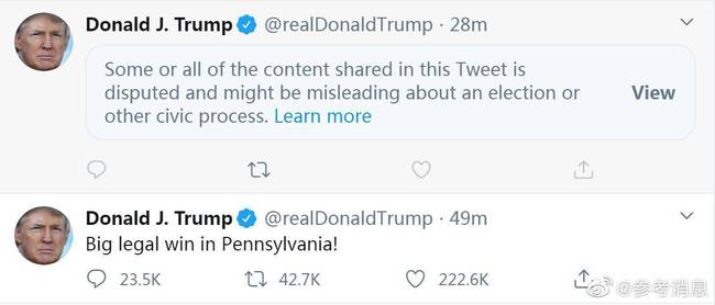 此前,他则发推称:“在宾夕法尼亚州取得法律上的巨大胜利!”