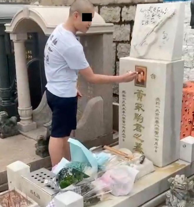 乐队Beyond主音黄家驹1993年离世后,安葬于将军澳华人永远坟场,今早11时多,其墓碑竟遭一名自称“社会破坏者光头Bob”的男子疯狂破坏,该男子一边唱《海阔天空》,一边向墓碑淋汽水、涂污墓碑,又用铁锤重击碑上照片等,行为简直人神共愤。目前警方已拘捕涉案男子,而墓碑暂时以白布围封。