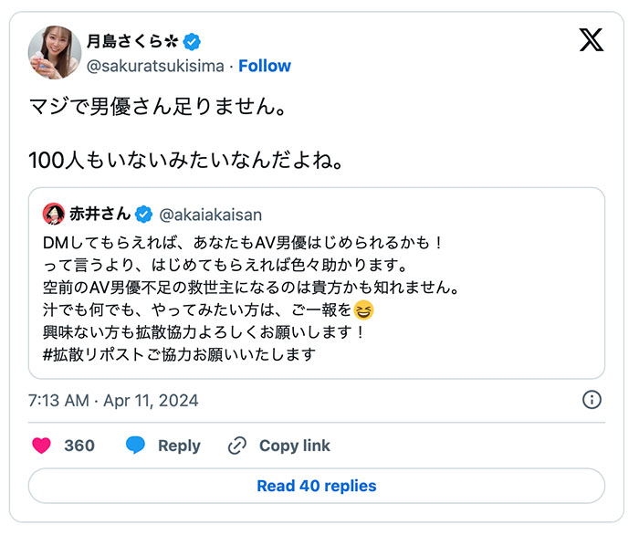 业界反新法的代表人物,也是女演员的月岛さくら(月岛樱)证实了赤井さん的说法,她说目前业界的男演员应该不足100人吧,对比女演员如雨后春笋般地出道真的是敌众我寡棒子不够用,状况不太妙⋯