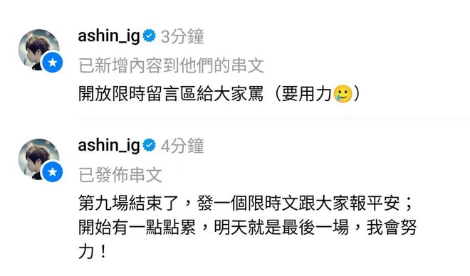 阿信突在IG分享演唱会照片,虽然没附上任何文字,但也引来歌迷高度关注,今凌晨他在Threads上发文:「第九场结束了,发一个限时文跟大家报平安;开始有一点点累,明天就是最后一场,我会努力!」
