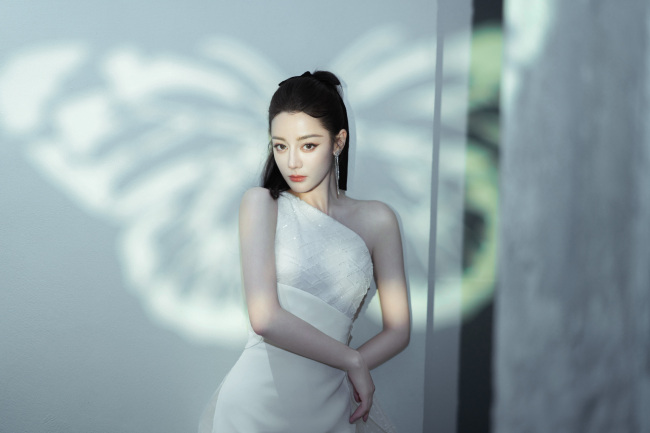 迪丽热巴身穿白色露肩短裙 气质高贵似公主
