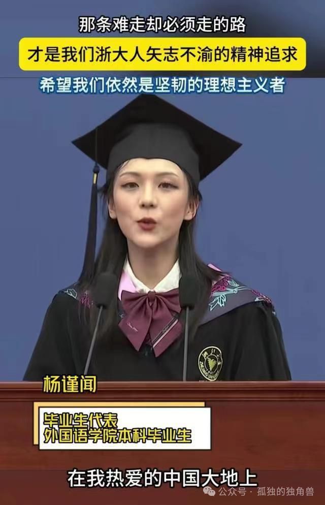 浙江大学应届美女毕业生杨谨闻双修翻译与法律,不是因为她的高颜值,而是因为她优异的成绩、高尚的爱国情操,以及坚定不移的党性,6月获选为最光荣的毕业生致辞代表。