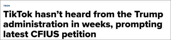?”报道中援引知情人士的话透露说,TikTok已经好几周都没有与美国外国投资委员会(CFIUS)进行有意义的对话了。同一天,TikTok也发布声明称,他们积极与CFIUS沟通,但目前尚未得到CFIUS的任何实质性反馈,为此他们不得不再次向法院上诉,申请叫停强制剥离TikTok在美业务的“交易禁令”。