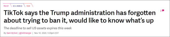 眼看“交易禁令”的最后期限将至(11月12日),特朗普政府却没了声音,美国CNBC于11月10日发文向其喊话说,“还记得TikTok吗