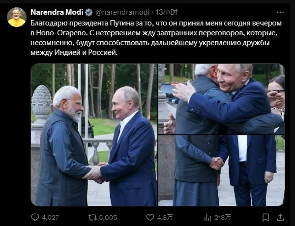 莫迪发布与普京拥抱照片,惹恼泽连斯基 推文截图