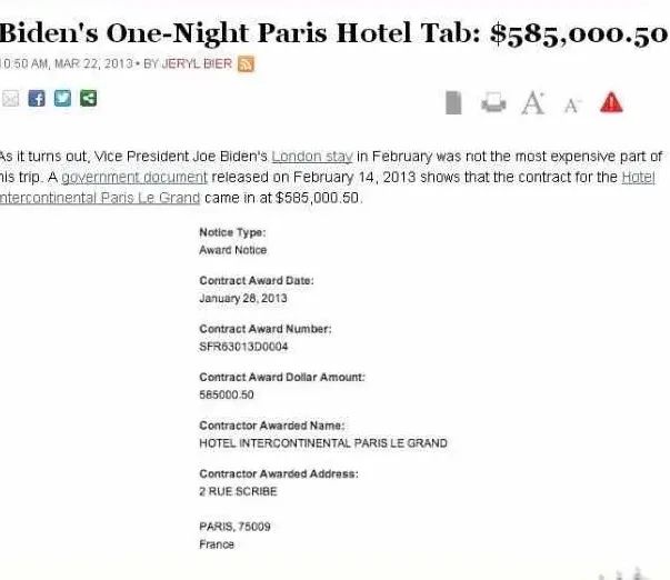 2013年拜登访问巴黎,在酒店住一晚的费用就是58万美元,被美国各界狠批。