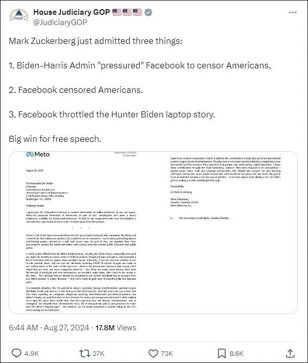 当地时间8月27日,美国众议院司法委员会官方账号发布了一份META公司首席执行官扎克伯格的来信。
